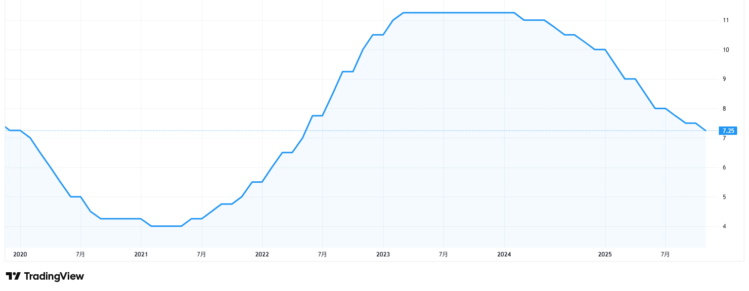 市場では、年末の政策金利が7.5%程度になるとの予測が主流ですが、インフレの再加速や米国の政策変更による不確実性を踏まえると、利下げの余地は限定的との見方が強まっています。